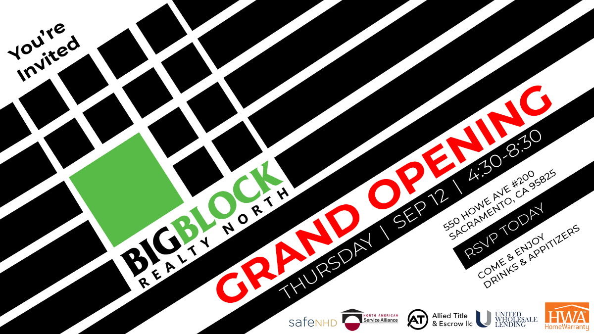 JOIN US🚨 You Don't Want to Miss the Celebration 🚨Come out and join Big Block Realty North for the highly anticipated Grand Opening of their new office. 🎉The party starts at 4:30 PM on September 12th.Arrive ready to celebrate with the BBRN Team and enjoy light appetizers and drinks.🥂🍾Location:550 HOWE AVE #200SACRAMENTO, CA 95825
