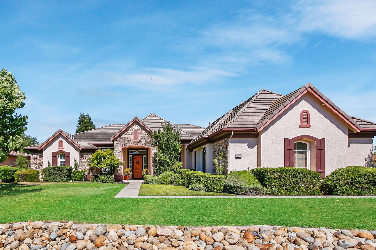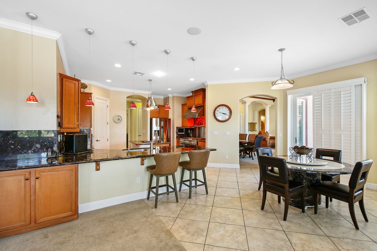 Fabulous 1 story home in desirable Hearthstone gated community. Corner lot. Boasting 11 columns throughout. Two beautiful inlaid mosaic medallions imported from Spain. Vaulted 12-foot ceiling in the living & family room complete with crown molding and imperfect smooth finished walls throughout the house. Large kitchen w/ Palladium granite kitchen countertops. The island and the backsplash are completely covered w/ Palladium granite all the way to the professional hood w/ food warming lights. Professional 48 inch GE Monogram range w/ dual ovens, the range has 6 burners & professional grill. Custom-built bookshelf in the library & a custom entertainment center in the family room. The Master bathroom is completely covered w/ granite, including master shower w/ his and hers sinks and jetted tub. 5 bedrooms w/ additional built-in office/study space. 11 built-in speakers throughout the house for surround sound. Large backyard w/ almost 1100 square feet of patio and unique water fountain.